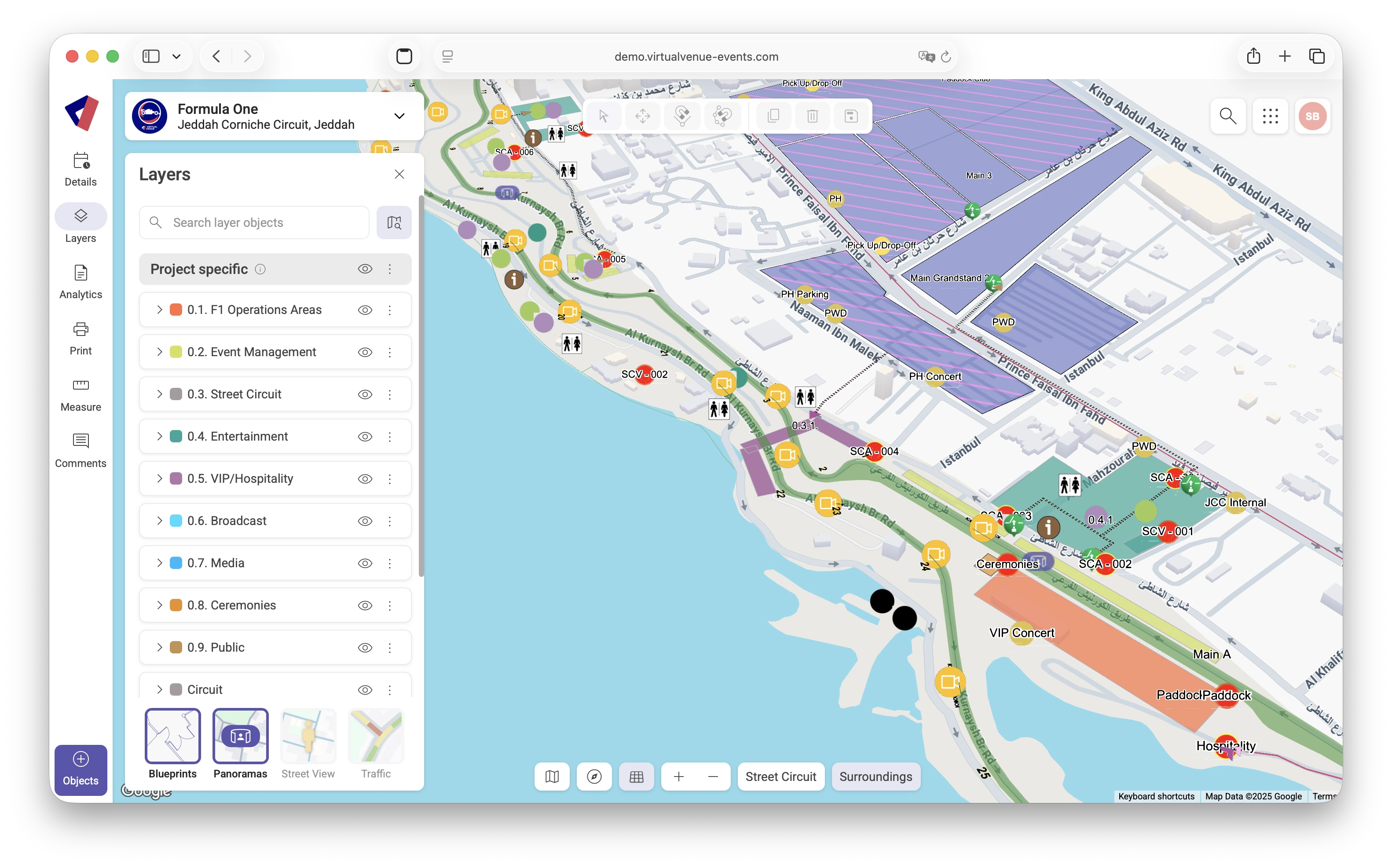 Quickly map out event zones, infrastructure, signage or equipment locations over existing site plans, floorplans or base maps. All overlays are editable, layered and version-controlled, providing a flexible framework that grows with the project.